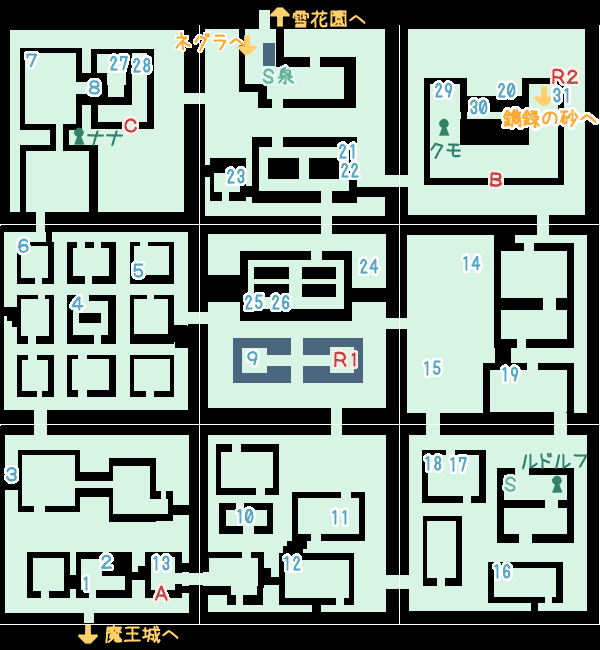 番号は宝箱、"S"はセーブポイント、"泉"は回復の泉。A〜Cは仕掛けなどがある場所。