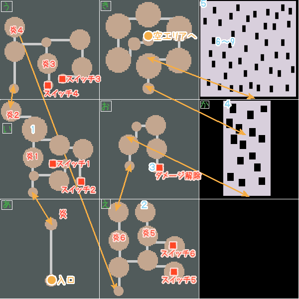 ダメージ解除のスイッチを押すと『か』のマップのダメージを受けなくなる。