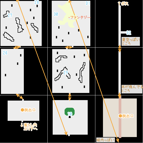 | 32 | 夢想の羽 | 星空っぽいところに一箇所右にいけるところがあり、そこを調べる。 ※旧バージョンだと通路の左 |